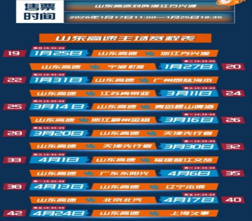 闪电体育1月17报道1月25日,山东高速男篮将重返山东省体育中心山东高速篮球馆,开启本赛季在济南的首个主场赛事,届时将与浙江广厦展开激烈对决。日前,官方售票通道已正式开启,并将持续开放至1月25日18:35。